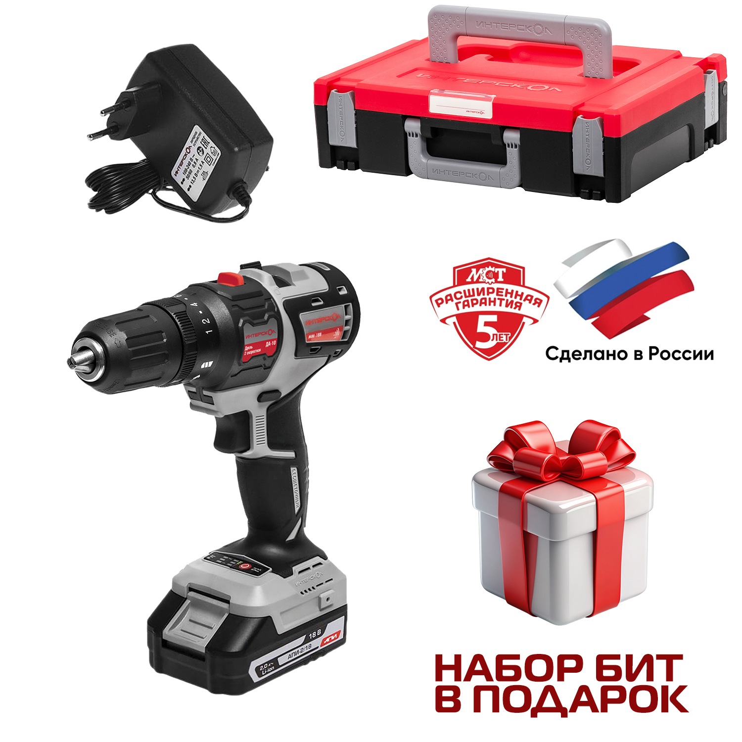 Дрель-шуруповерт 18В 2скор.0-400/0-1450об/мин 44Нм 2Ач 2аккум Б/Щ LI-ION ДА-10/18В ИНТЕРСКОЛ *1/4