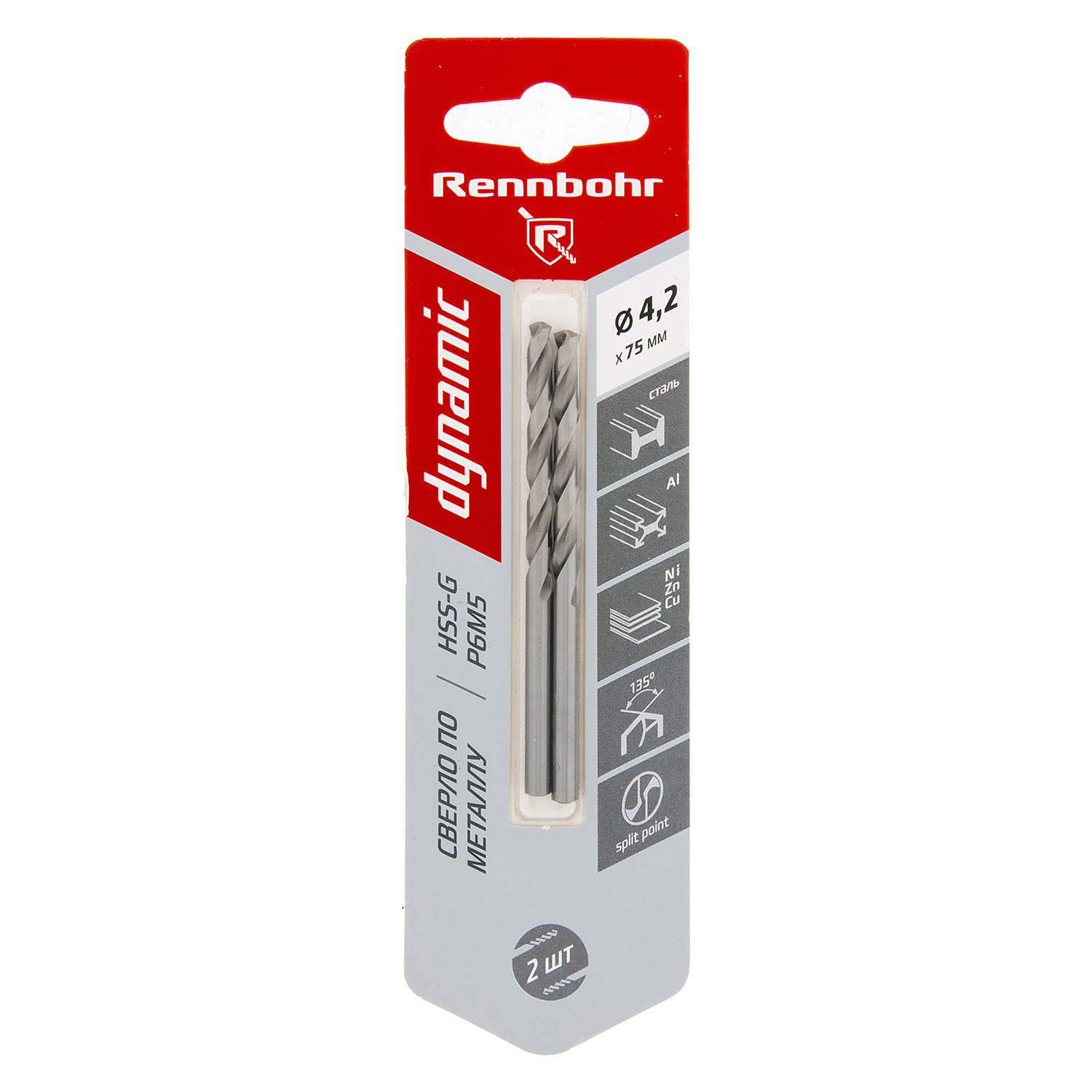 Сверло по металлу 4,20*75/43мм HSS-G P6M5 (2шт) блистер арт.675042 DYNAMIC RENNBOHR *10/40/640