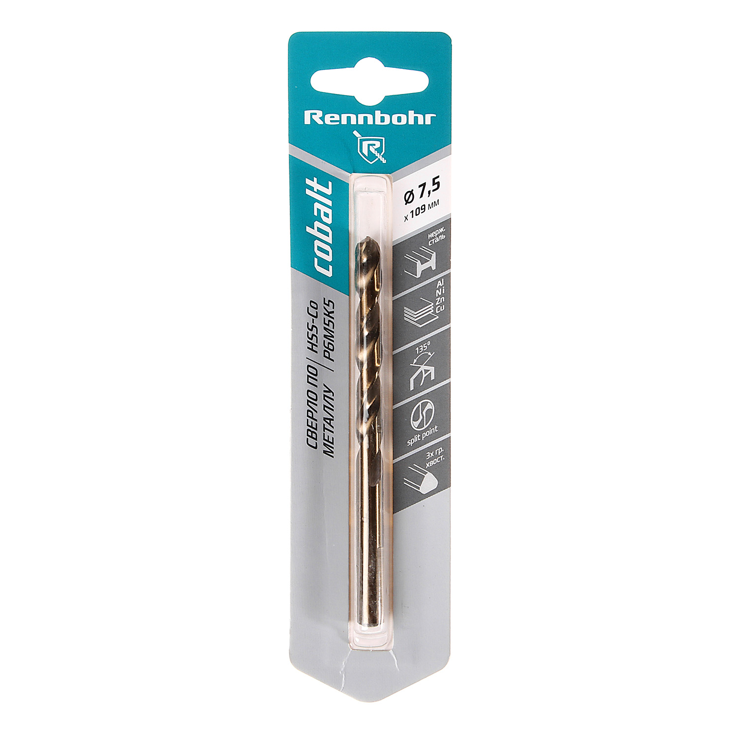 Сверло по металлу 7,50*109/69мм HSS-Co P6M5К5 (1шт) блистер арт.668075 COBALT RENNBOHR *10/40/320