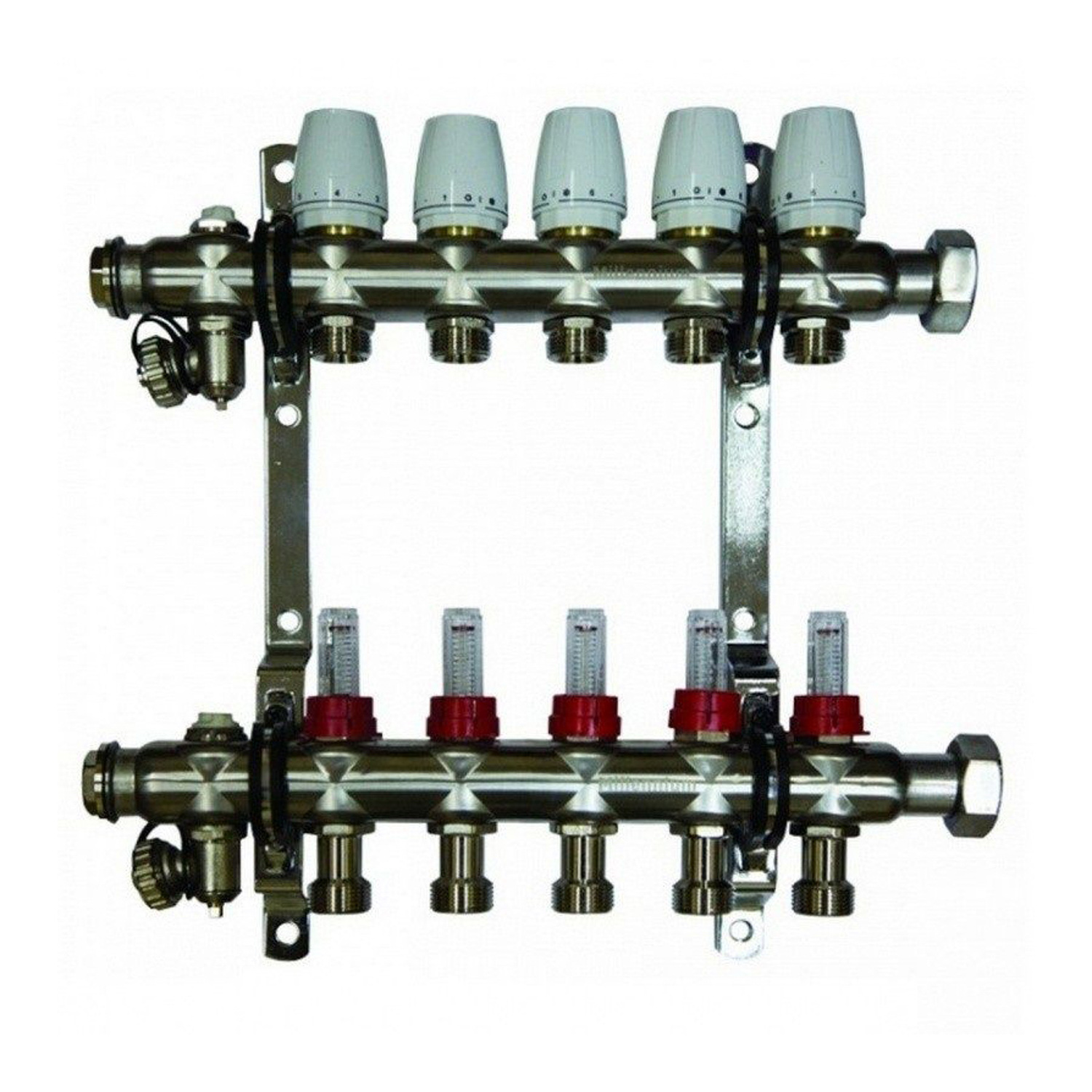 Коллекторная группа Millennium с расходомерами выполнена из нержавеющей стали, имеет регулировочные и термостатические вентили. Применяется при монтаже радиаторного отопления и теплых полов.