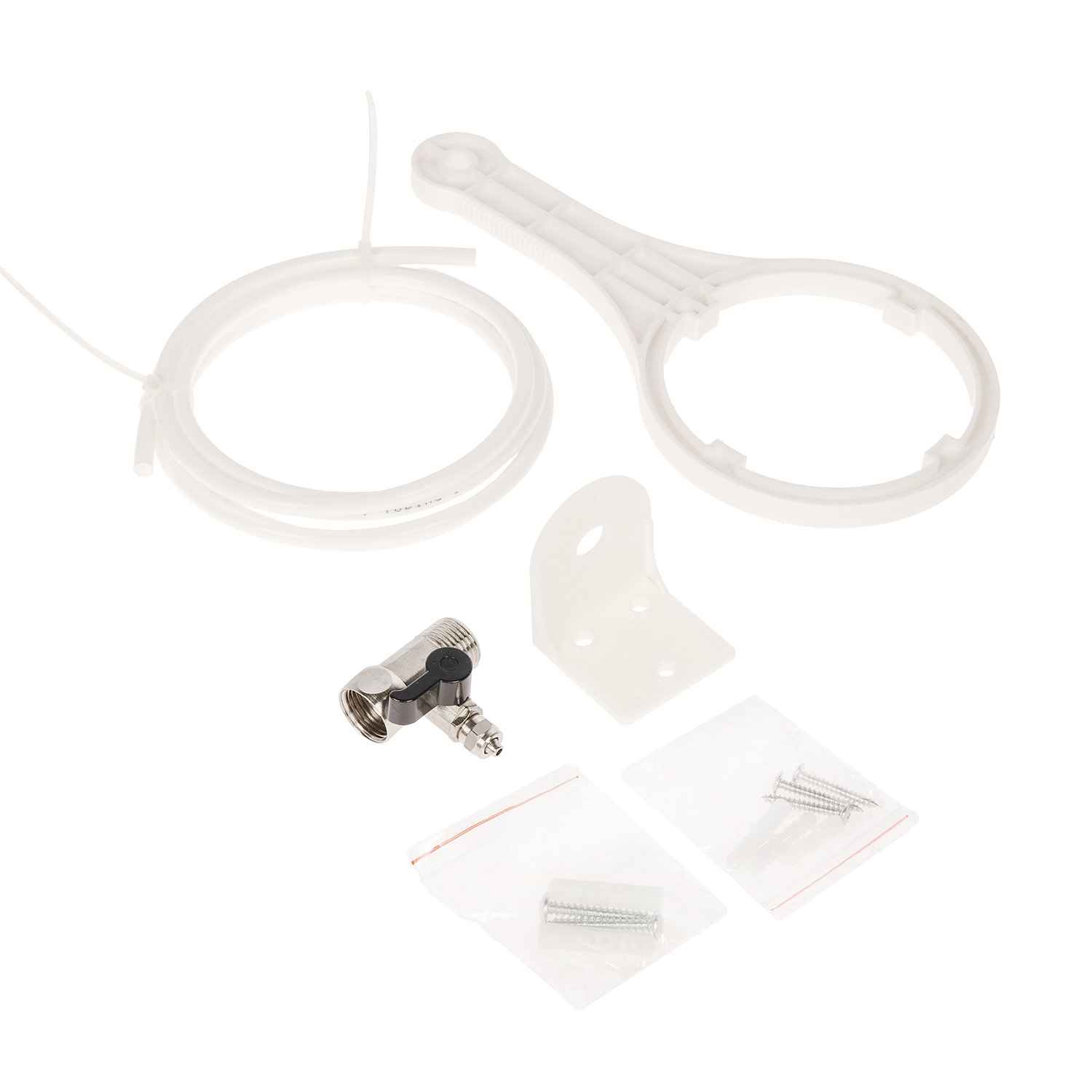 Стандартный 10 дюймовый корпус, сменный картридж для механической очистки (полипропиленовый), сменный картридж для удаления солей жесткости (Cation-Anion), сменный картридж для комплексной очистки (угольный СТО-10), постугольный фильтр 50 мм, постугольный фильтр 60 мм; соединительная трубка для соединения питьевой системы с водопроводом и краном чистой воды, поршневой кран для чистой воды (излив), ключ для снятия колб, крепления, инструкция |