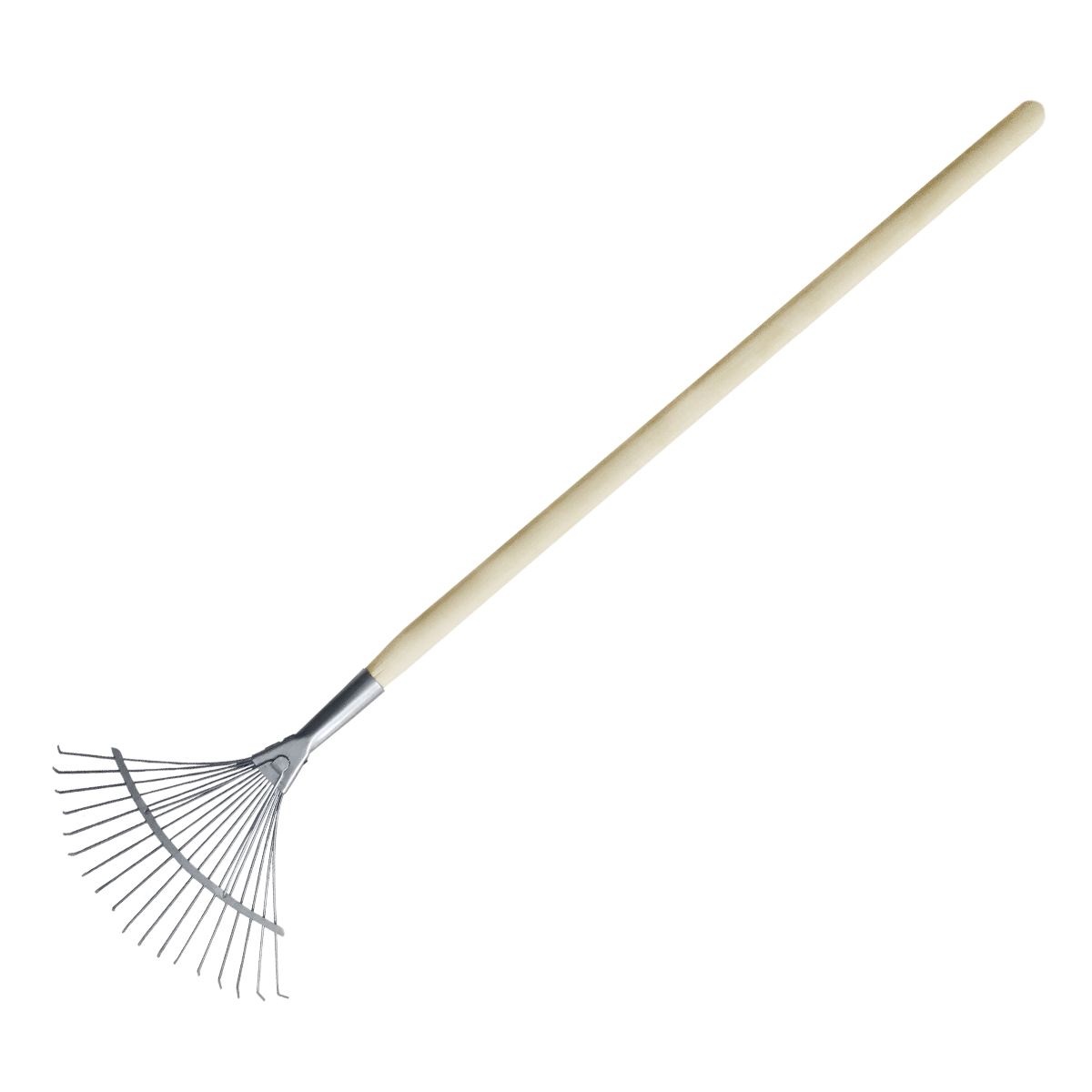 Веерные грабли с черенком, 18 зубьев - прочный материал, из которого выполнен инструмент, обеспечивает удобство в работе.