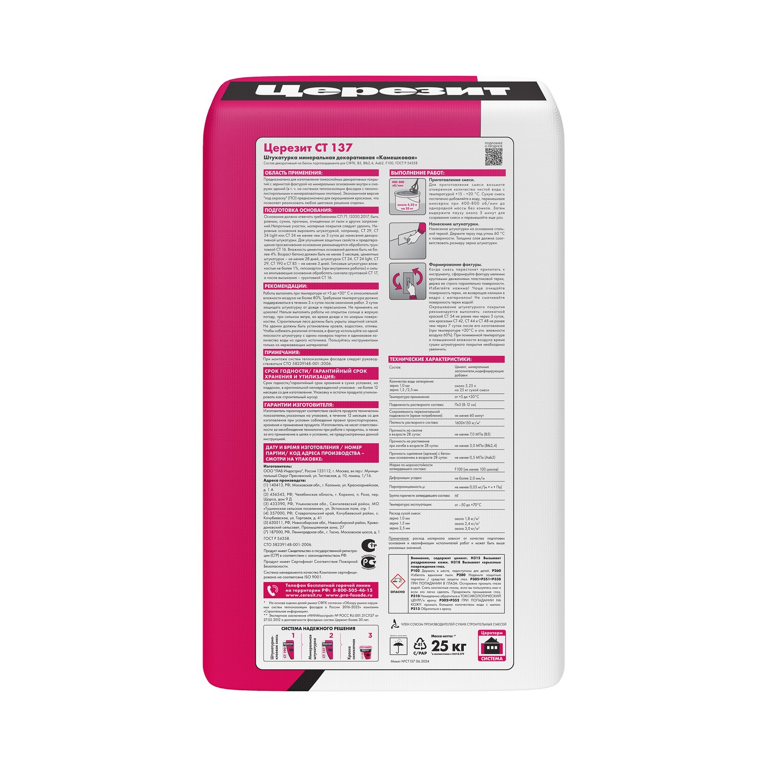 Декоративная штукатурка CT 137 предназначена для изготовления тонкослойных декоративных покрытий с зернистой фактурой на бетоне, цементных и гипсовых штукатурках, гипсокартоне, древесностружечных плитах и т. п. основаниях внутри и снаружи зданий, как при ручном, так и механизированном нанесении.